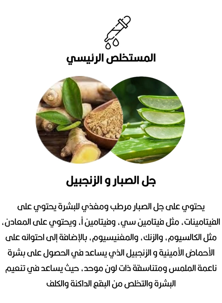 يحتوي على مزيج طبيعي من مستخلص جل الصبار والزنجبيل ، المعروفين بخصائصهما المهدئة والمرطبة التي تترك بشرتك ناعمة، مرنة ومعطّرة بعطر يدوم طويلاً. غني بالجلسرين النباتي وبدرجة حموضة متوازنة، مما يجعله مثاليًا لكافة أنواع البشرة، حتى الحساسة منها.